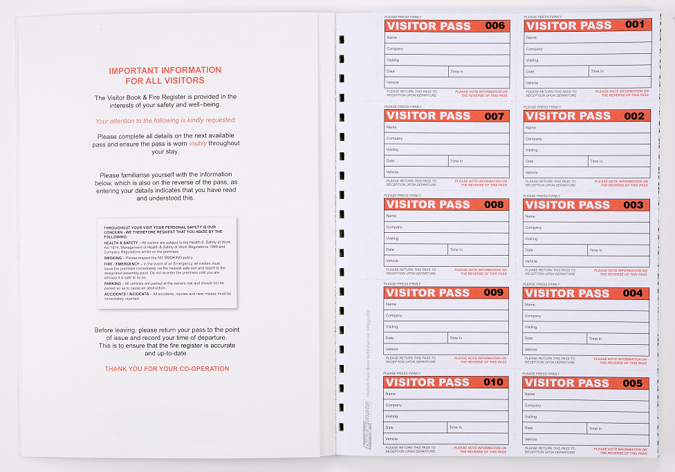 Practical visitors books contained in stylish leather look padded cover. The inserts are GDPR Compliant. The visitors books contain 100 easy to complete badge inserts. The perforated top copy tears out for insertion into a visitor badge and duplicate deta