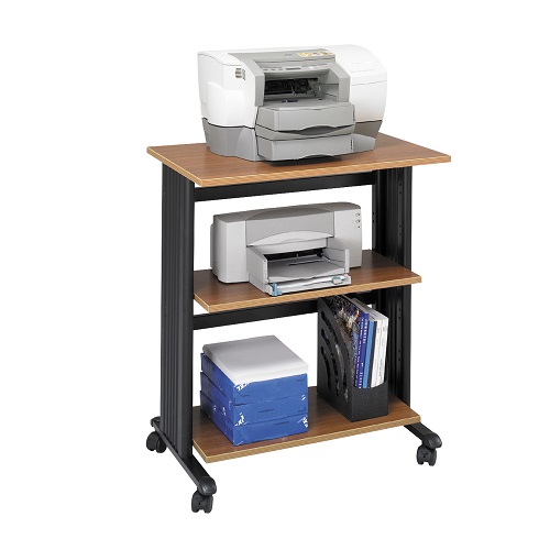 Muv Three Level Adjustable Printer Stand. Durable ¾" thick melamine laminate adjustable shelves with PVC side panels. Powder coat steel frame. Mobile on four swivel casters (two locking) and adjustable desk-height printer stand with two adjustable shelve